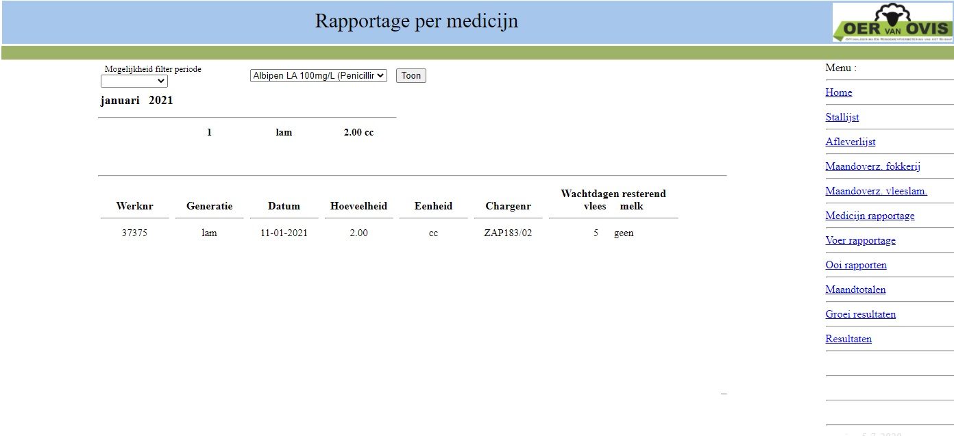 In één overzicht per medicijn, welke hoeveelheid is toegediend, aan welke dieren. Ook is hierin terug te zien welke chargenummer is toegediend, mits dit is vastgelegd bij de inkoop van het medicijn. Het chargenummer is terug te vinden op de factuur. Bij de inkoop is ook de mogelijkheid om het aantal wachtdagen vast te leggen. Als de inkoop geboekt wordt in de financiële module zal de liquiditeit en de saldoberekening gevuld worden