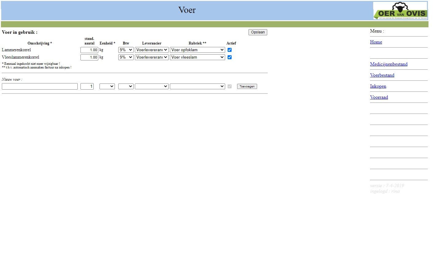 In één overzicht te zien alle voersoorten die op het bedrijf worden gevoerd. Vastgelegd wordt de crediteur en aan welke rubriek (bv. Voer moederdier) dit wordt toegekend in de financiële module. Om voer toe te dienen moet het voer zijn ingekocht en op voorraad.