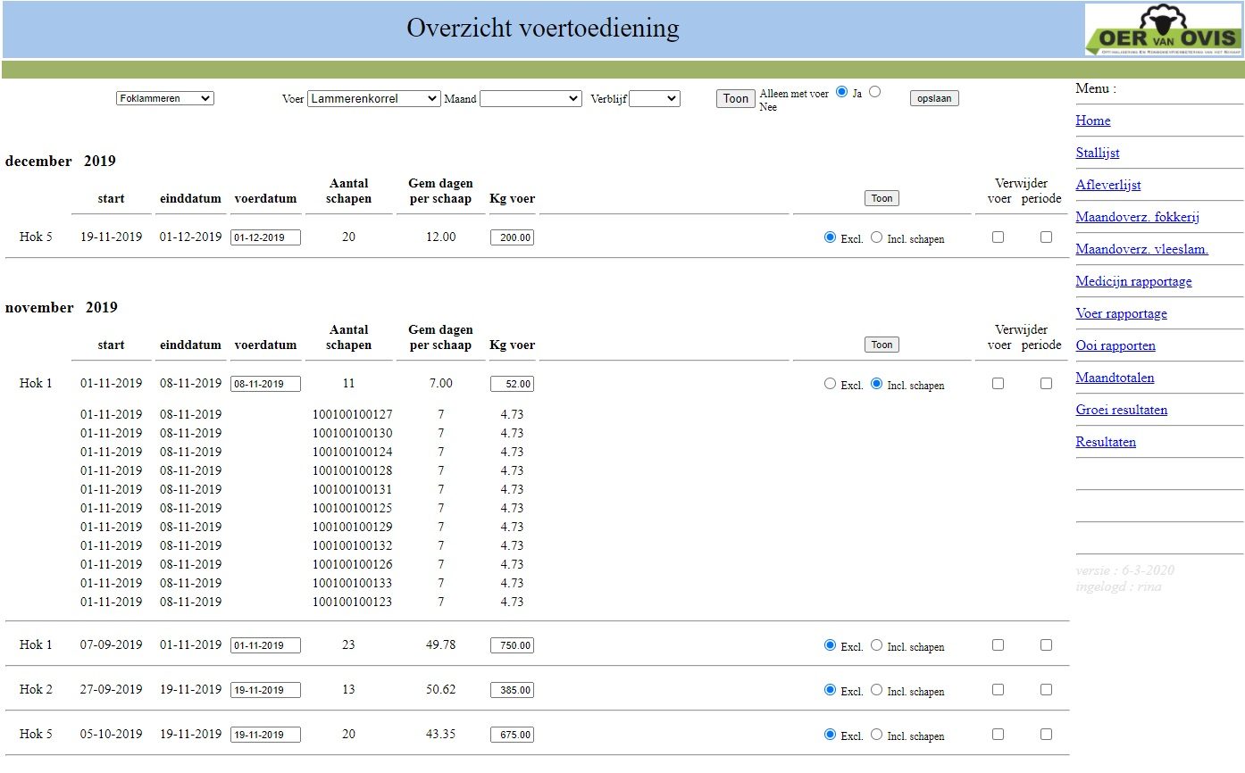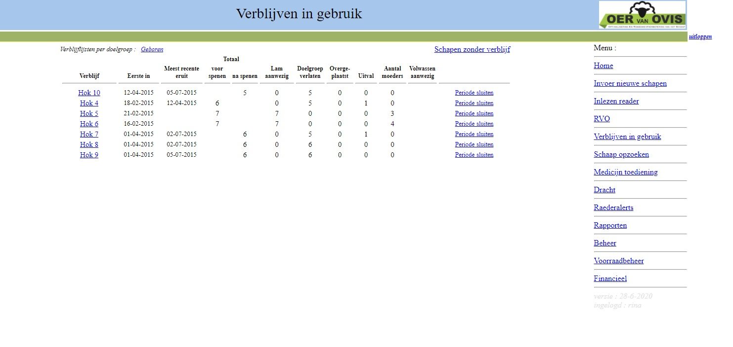 In dit overzicht vindt u per verblijf terug, het aantal dieren in een verblijf. Deze worden op doelgroep getoond, geboren of gespeend, dus voor spenen of na spenen. Ook word hier de eventuele uitval getoond. Door met verblijven te werken, kunt u ook voer toedienen werken. Op het moment dat de lammeren het verblijf verlaten is er de mogelijkheid om via de link periode sluiten, voer toe te dienen. Het soort voer en het aantal kilo’s. Dit wordt weer getoond in de voerrapportage. Dit voer hebt u al geregistreerd voer bestand, en ingekocht bij inkopen, het voer is dan ook te zien bij de voorraad.
