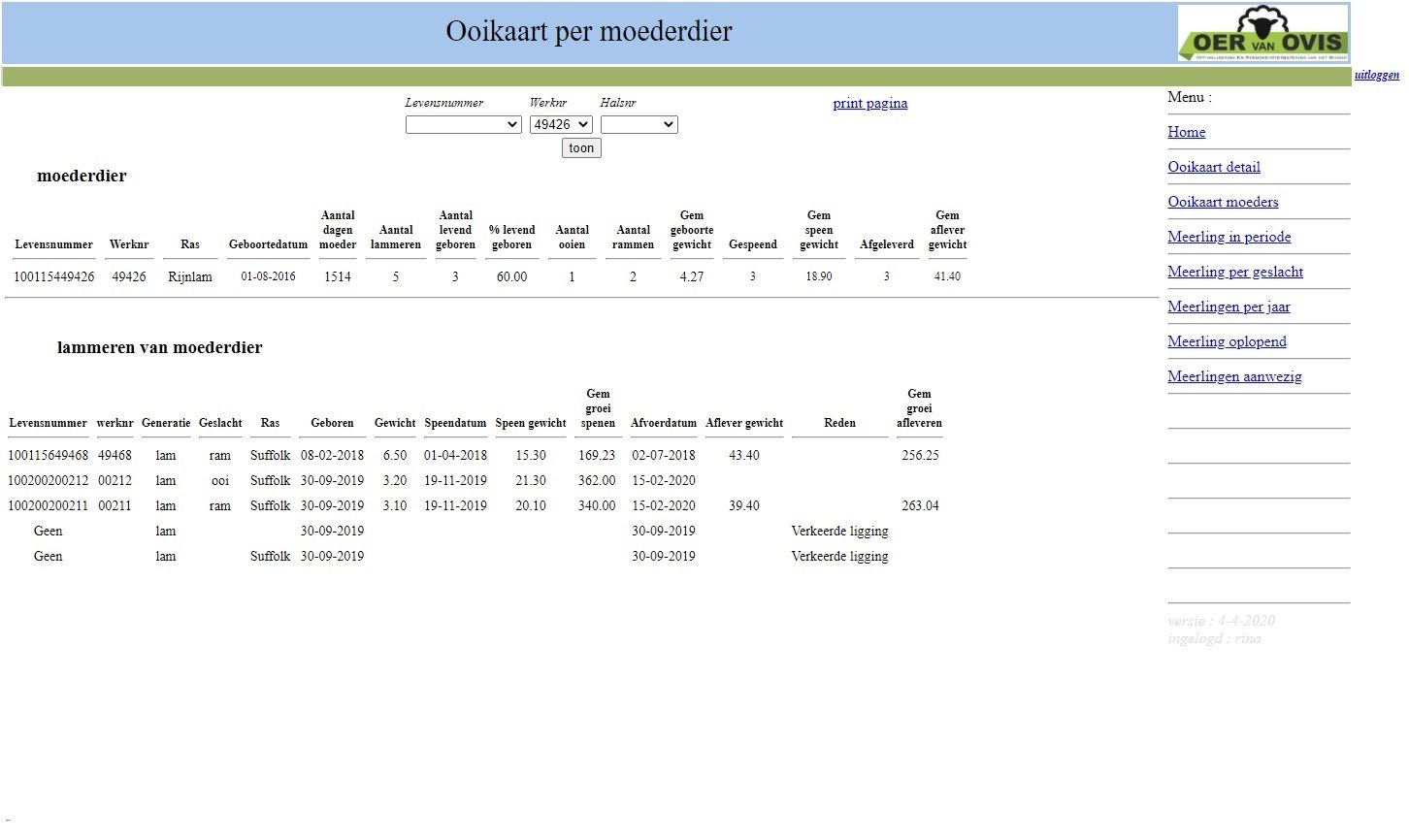 In dit overzicht staan alle moederdieren en is het overzicht is op verschillende manieren te selecteren. Bv. aantal lammeren, hoeveel ooien, hoeveel rammen enz. Door op de link van het werknummer te klikken kom je op de ooikaart. (zie volgend overzicht)