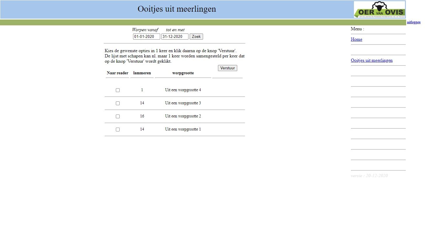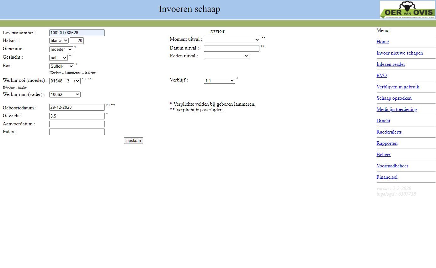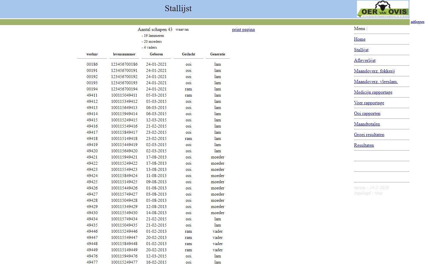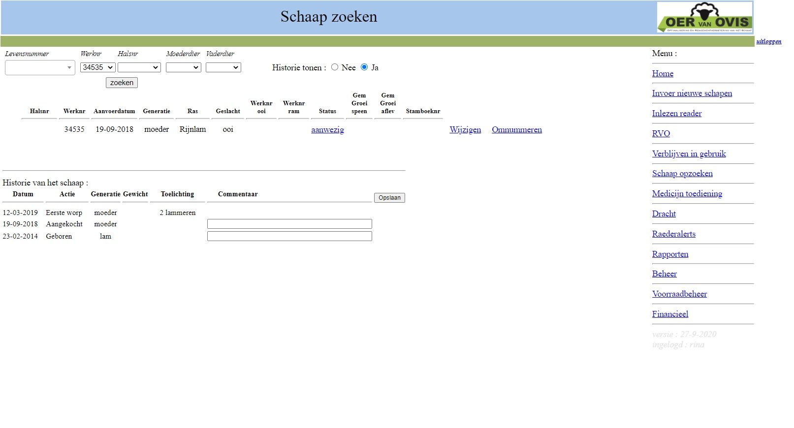 Met deze link kunt u ieder willekeurig dier opzoeken, wel of niet aanwezig. U ziet hier de historie van het dier. Door te klikken op aanwezig (alleen bij moederdier) ziet u de ooikaart. Klikken op wijzigen, hier is de mogelijkheid om een beperkt aantal gegevens aan te passen. Klikken op omnummeren, alleen gebruik van maken als er zonder reader wordt gewerkt, het omnummeren met dan nog handmatig in het RVO portaal worden gemeld.