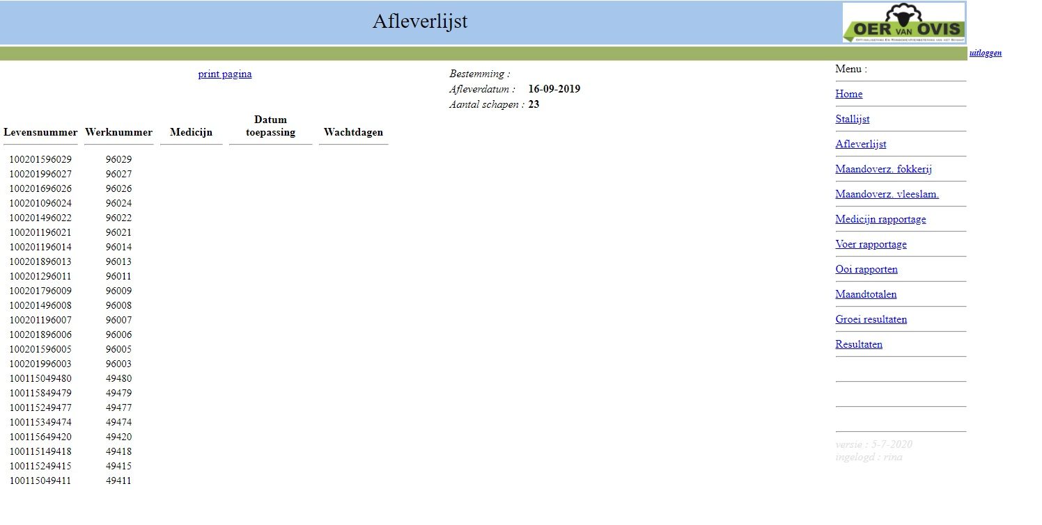 Op te vragen per afleverdatum. Op dit overzicht is te zien, de Bestemming met afleverdatum en het aantal af te leveren dieren. Hierop is ook te zien als een dier medicatie heeft gehad waarvan de wachtdagen nog niet zijn gepasseerd. De wachtdagen worden vastgelegd in de medicijnregistratie.