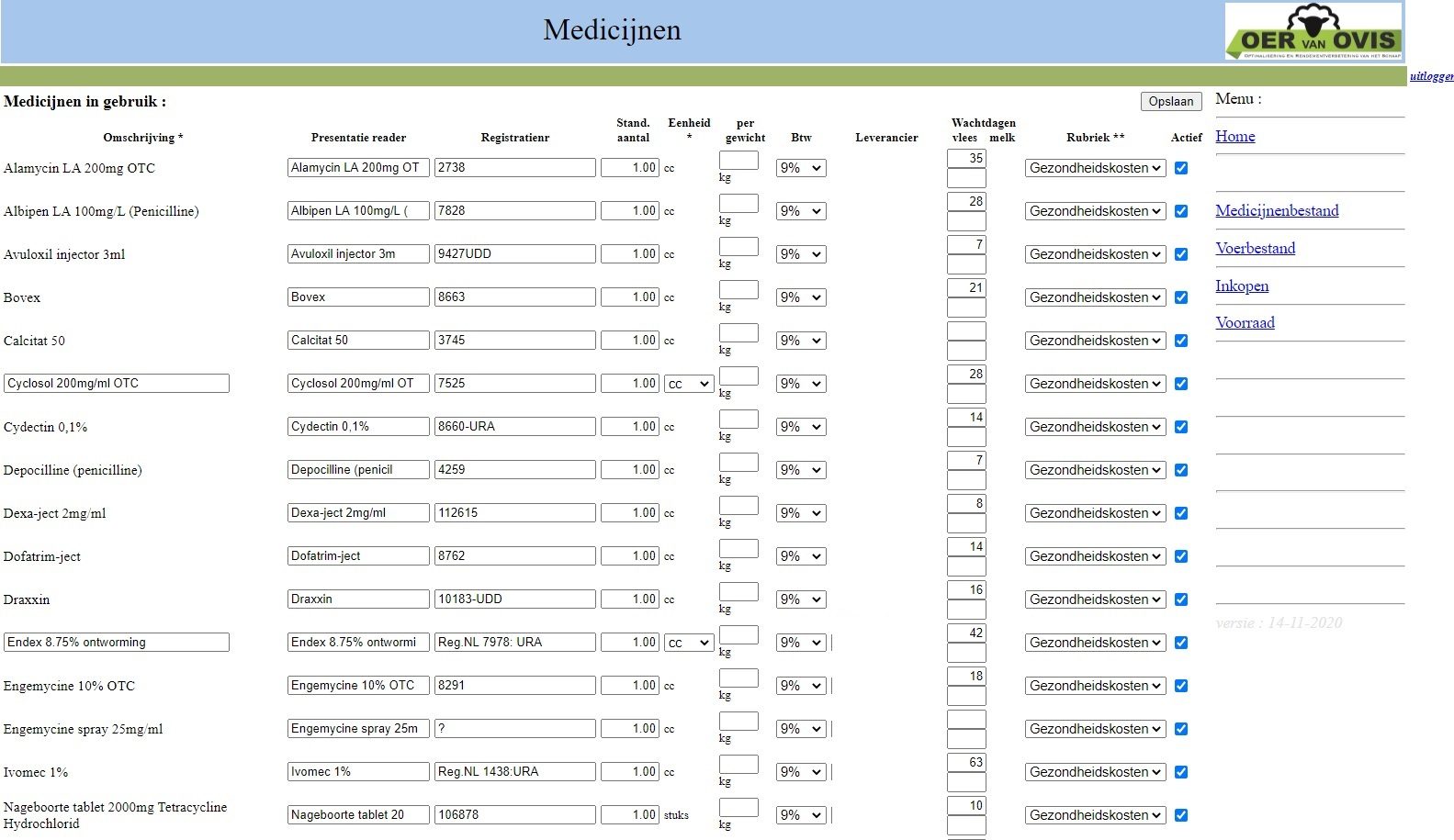 In één overzicht te zien alle medicijnen die op het bedrijf worden gebruikt. Deze zullen ook verschijnen in het keuzelijstje bij de taak medicatie. Vastgelegd wordt de crediteur en aan welke rubriek (gezondheidskosten) dit wordt toegekend in de financiële module. Om de taak medicatie uit te voeren moet het medicijn zijn ingekocht en op voorraad.